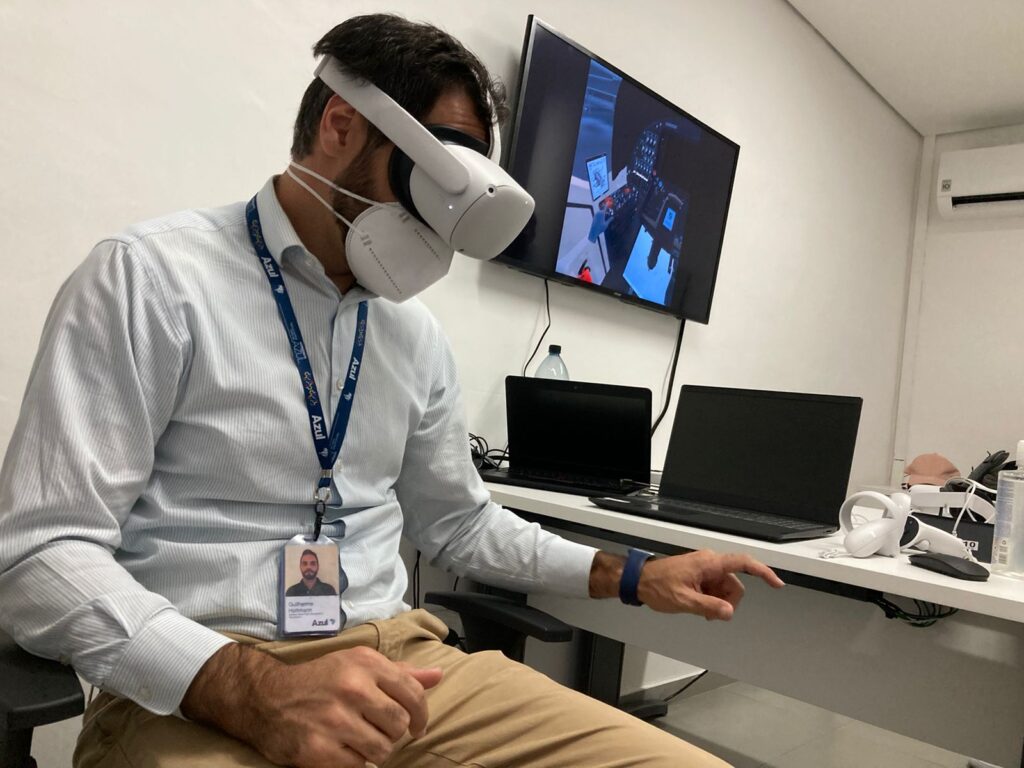A Azul Conecta acaba de implementar uma tecnologia, inédita no Brasil, que será utilizada no treinamento de novos pilotos e em cursos de reciclagem promovidos pela companhia. Criado em parceria com a Plan XP, empresa especializada em inovação e tecnologia, o óculos de realidade virtual utiliza o sensor de movimentos das mãos e exibe de forma 100% realista e em tamanho real a cabine de comando das aeronaves do modelo Cessna Grand Caravan.