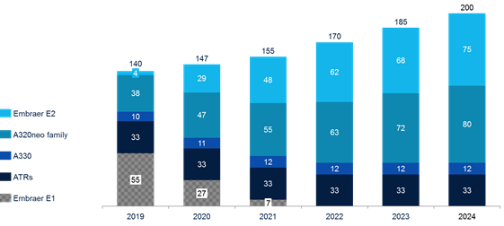 A Azul tem planos claros para expansão. Após fechar 2019 com 140 aeronaves na frota, a companhia divulgou o plano de operar 200 aviões em 2024, um aumento de 42%. Mais: a ampliação deve ocorrer com modernização, trocando os primeiros modelos operados pela companhia por versões mais modernas.