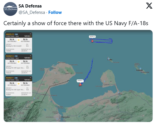 Um “corredor” com meros 8 km de largura, um espaço pequeno quando se fala em caças supersônicos. Foi nessa faixa estreita de espaço aéreo internacional que dois caças F-18 Super Hornet da US Navy voaram nesta terça-feira, 9 de novembro, bem perto da área de soberania venezuelana. O uso de aviões detectáveis ao radar, mesmo os EUA possuindo jatos stealth na área, e até a disponibilidade dessa rota em aplicativos de monitoramento de voos, caso do Flightradar24, evidenciam um tipo de provocação pública que ilustra o cenário de ampliações de tensões no ar.
