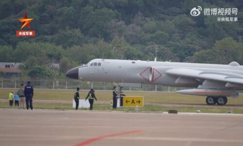 Um bombardeiro H-6 K da Força Aérea da China pousou nesta quinta-feira (3 de novembro) em Zhuhai, onde acontecerá o Airshow China 2022, levando o que parecem ser dois mísseis de um modelo ainda desconhecido. Pelas características, possivelmente trata-se de uma arma do tipo balística, com longo alcance.