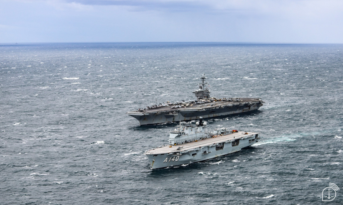 Navio Aeródromo Multipropósito Atlântico (à frente) recebe mantimentos de porta-aviões norte-americano para serem distribuídos no RS. Foto: Marinha do Brasil
