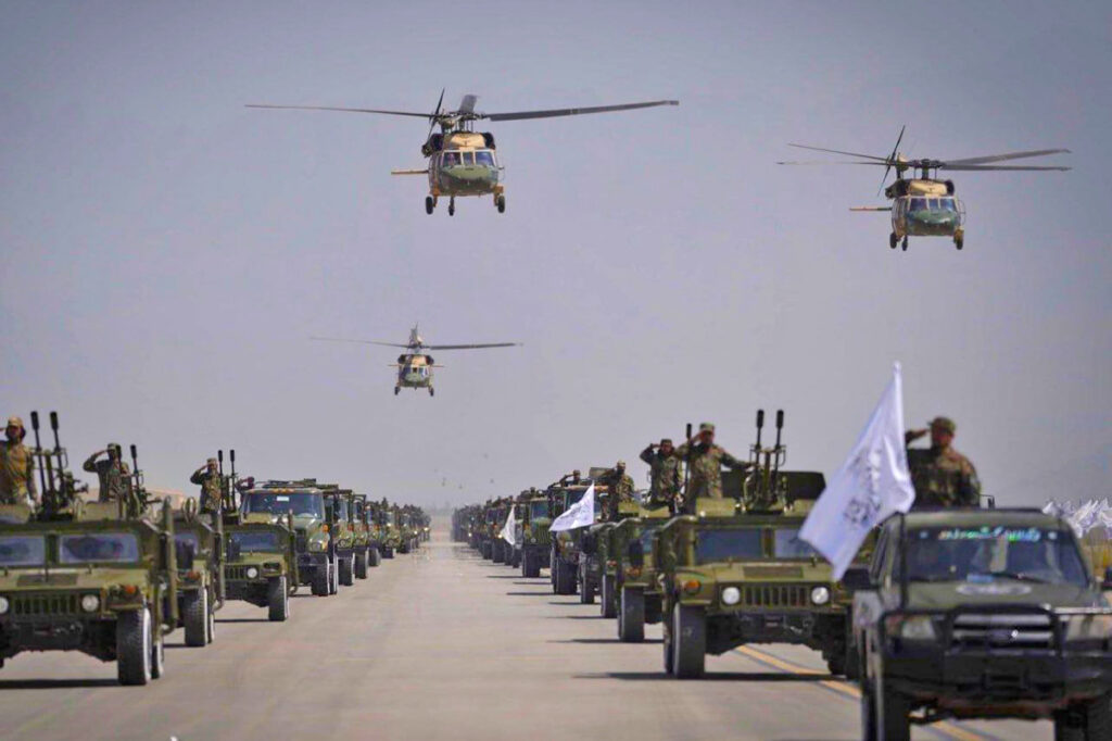 Desfile militar do Talibã, em 2024, com helicópteros Black Hawk