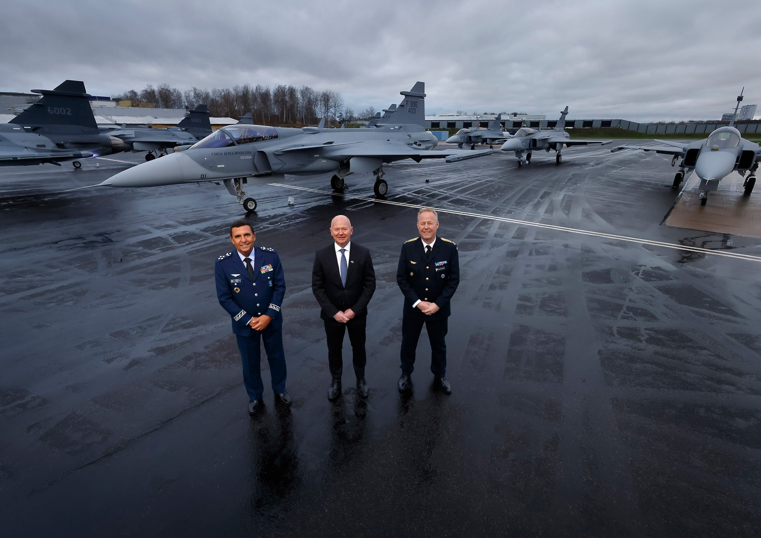O evento realizado pela empresa Saab em Linköping, na Suécia, também marcou a entrega oficial das duas primeiras unidades para a força aérea daquele país. Com matrículas 4101, 4102, 4103 e 4104, os quatro aviões de caça deverão chegar ao Brasil por via marítima. A programação prevê a chegada de dois em dezembro e de outro par em janeiro.