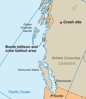 A tripulação, então, alijou a bomba a 2.400 metros e saltou de paraquedas. Mais de 40 aeronaves dos Estados Unidos e do Canadá foram envolvidas na missão de busca. Cinco ocupantes nunca foram encontrados, possivelmente tendo caído no mar e morrido de hipotermia. A aeronave se manteve em voo e acabou caindo já no continente, no monte Kologet. Os destroços, porém, só foram encontrados três anos depois.