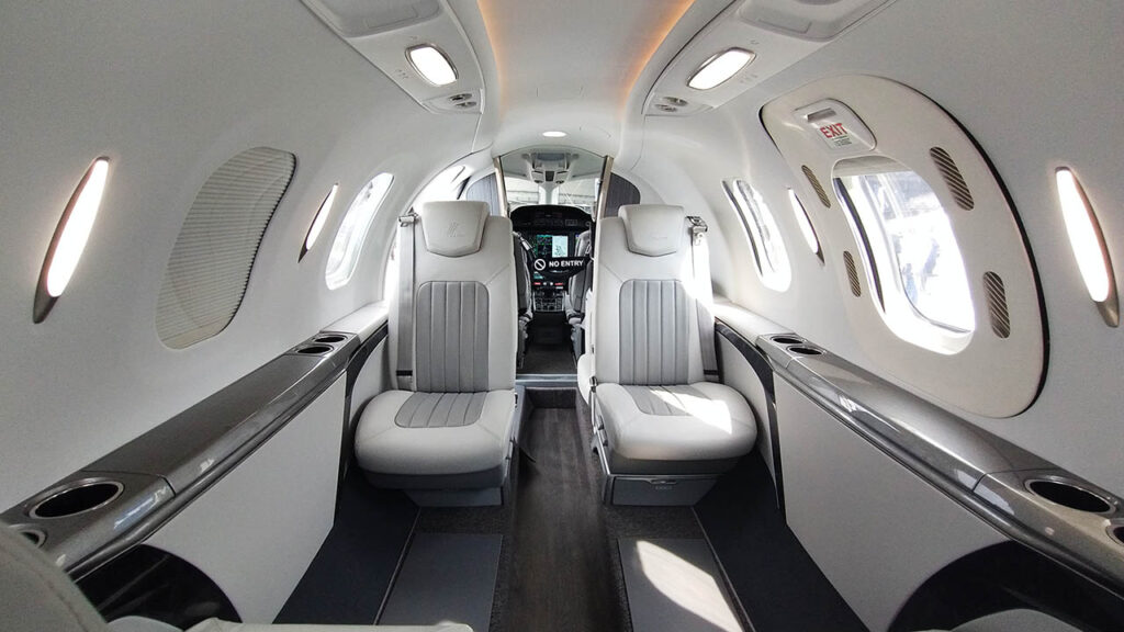 Em relação ao design da parte exterior, a aeronave traz duas novas versões de pintura: preto fosco e branco com faixa vermelha, além das cores já existentes. O interior também apresenta novidades, com novos padrões de cores em ônix e metálico, incluindo elementos com tons de madeira nos assentos e no piso.