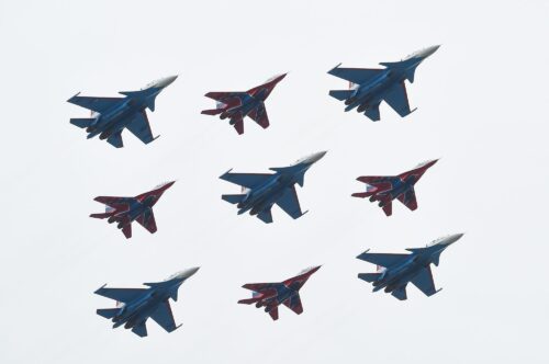 Nas fotos divulgadas pelo Ministério da Defesa da Rússsia é possível observar formações com aeronaves MiG-31 equipadas com os mísseis hipersônicos Kh-47 Kinzhal e os caças stealth Su-57 Fellon. Bombardeiros Tu-160 Blackjack, Tu-22 Backfire e Tu-95 Bear, caças MiG-29 Fulcrum e Su-27/30 Flanker, aviões de ataque Su-24 Fencer, helicópteros de ataque Mi-35M, Ka-52 e Mi28N, reabastecedores, cargueiros e aviões-radar também participaram, além da esquadrilha de demonstração Russian Knights.