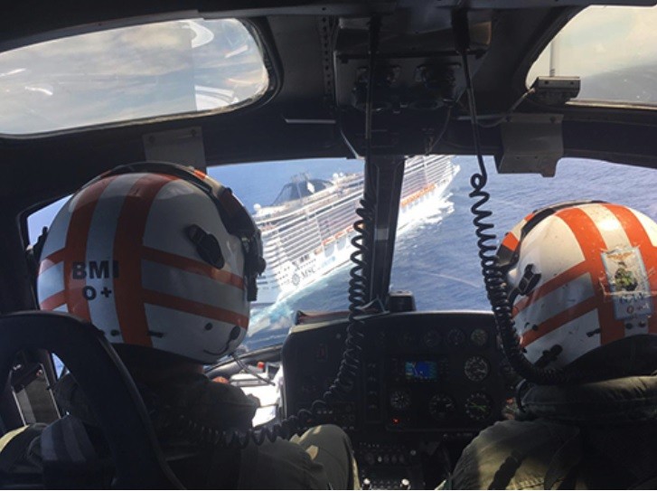 Um helicóptero UH-12 Esquilo do 5º Esquadrão de Helicópteros de Emprego Geral, sediado em Rio Grande (RS), voou acima do navio “MSC Fantasia” e fez o procedimento chamado de Pick-Up, em que uma maca é acoplada ao guincho lateral.