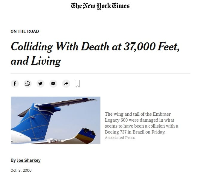 O texto afirma que os ocupantes do Legacy sequer perceberam o que aconteceu. Ainda assim, os 30 minutos de voo até o pouso em segurança foram descritos como angustiantes. Os pilotos lutaram com a aeronave danificada e, somente horas após o pouso souberam do Boeing. O texto de Joe Sharkey dá um tom de heroísmo aos tripulantes do Legacy.