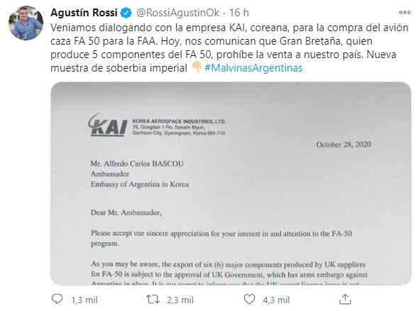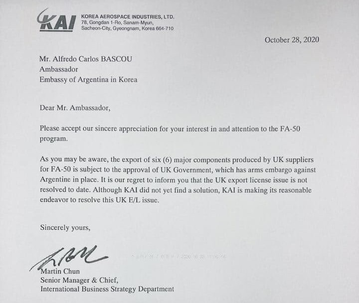 Os planos da Argentina para adquirir caças sul-coreanos FA-50 Golden Eagle foram barrados pelo Reino Unido. A empresa Korea Aerospace Industries enviou uma carta no dia 28 de outubro para o embaixador da argentina no Coreia informando que não foi concedida a licença de exportação para os seis componentes dos caças FA-50 que são fabricados no Reino Unido.
