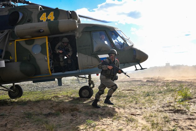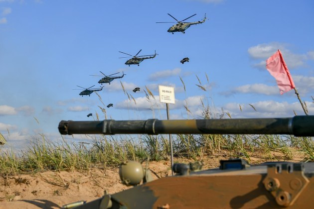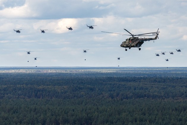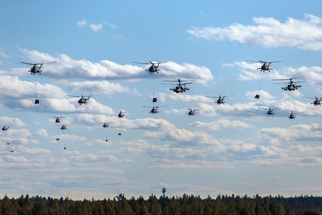A Rússia mandou 32 helicópteros da família Mi-8, especializados no transporte de tropas, e mais 14 unidades de ataque dos modelos Ka-52 e Mi-28N para o exercício Zapad-2021, realizado com a Bielorrússia. Também há aeronaves Mi-24/35 nas fotos divulgadas pelo Ministério da Defesa russo.
