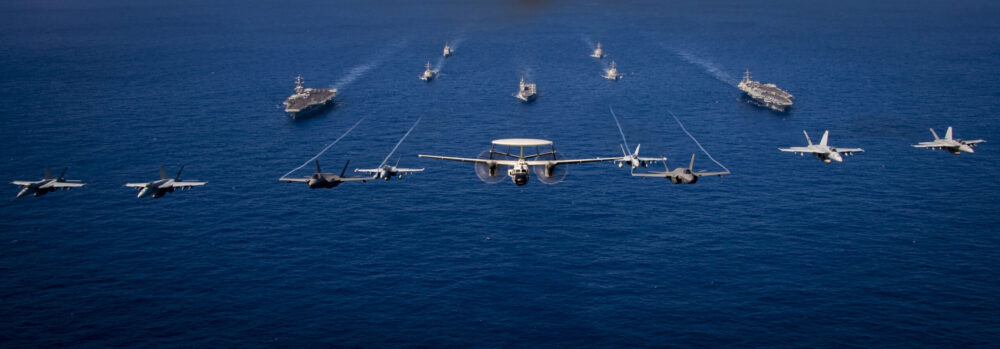 A foto captada em 31 de janeiro mostra, no mar, os porta-aviões USS Theodore Roosevelt (CVN 71) e USS Carl Vinson (CVN 70) ao lado do cruzador USS Princeton (CG 59) e dos destróieres USS Daniel K. Inouye (DDG 118), USS Rafael Peralta (DDG 115) e USS Sterett (DDG 104). Também está na foto o porta-helicópteros JS Ise (DDH 118), do Japão.